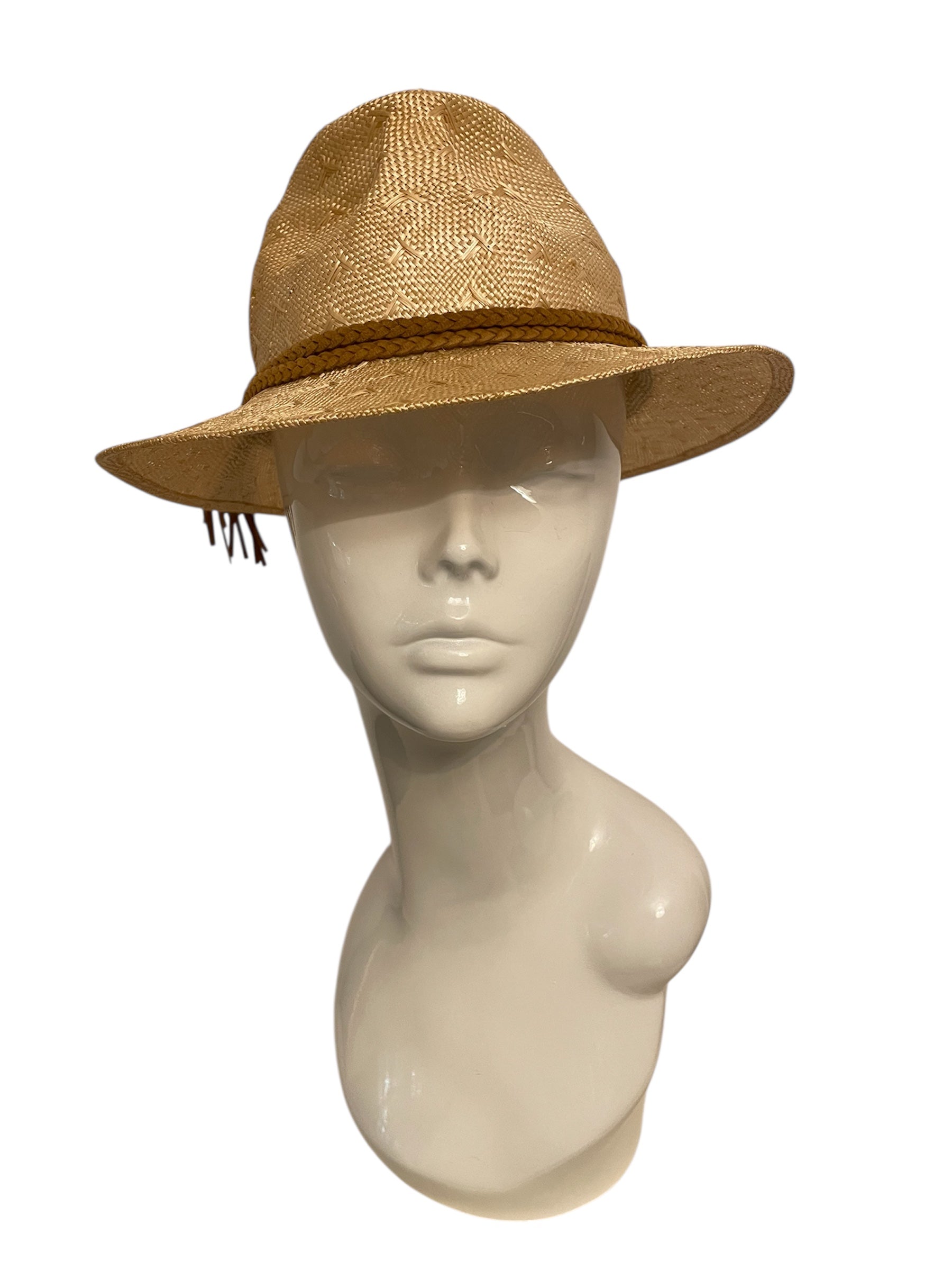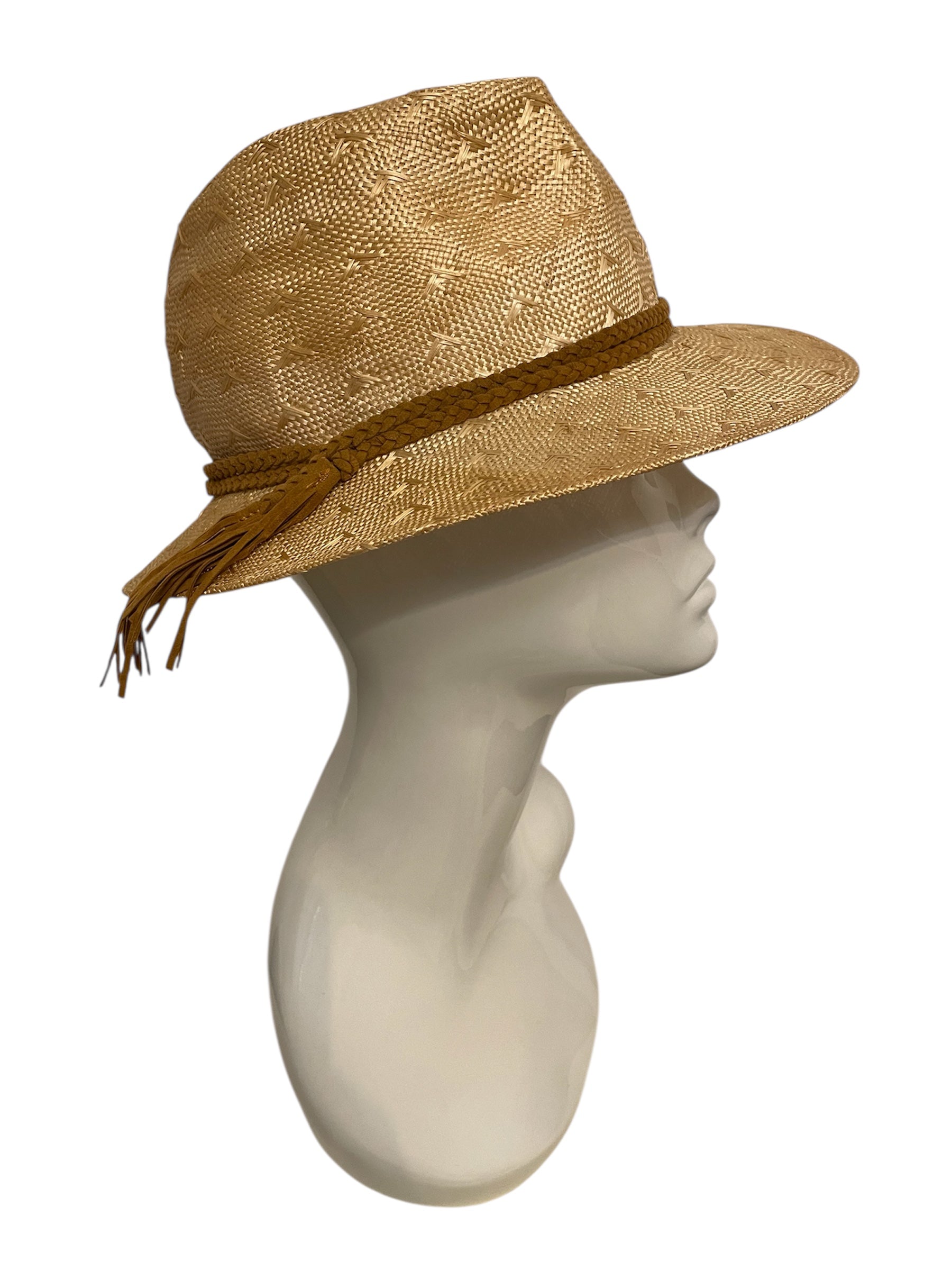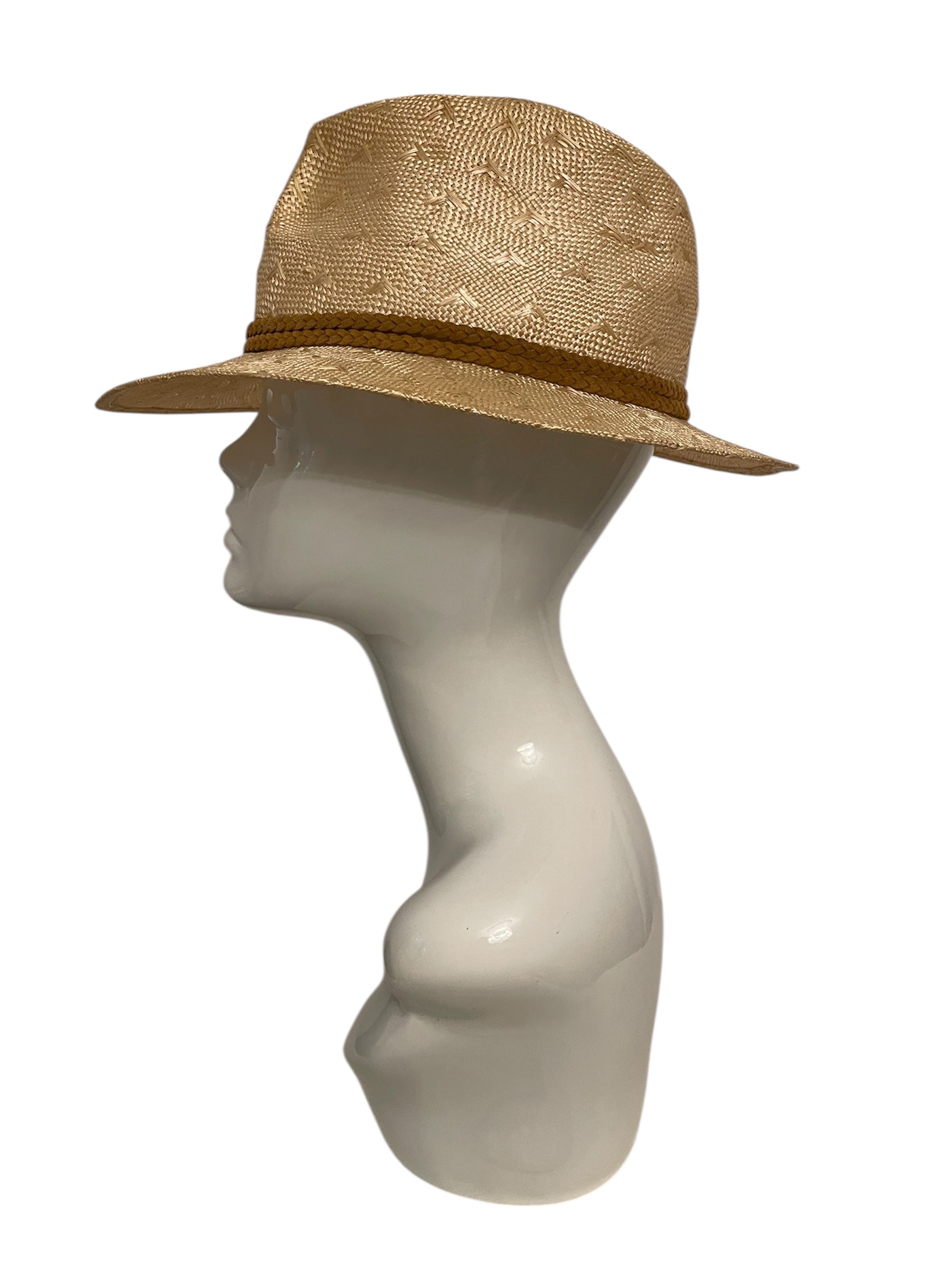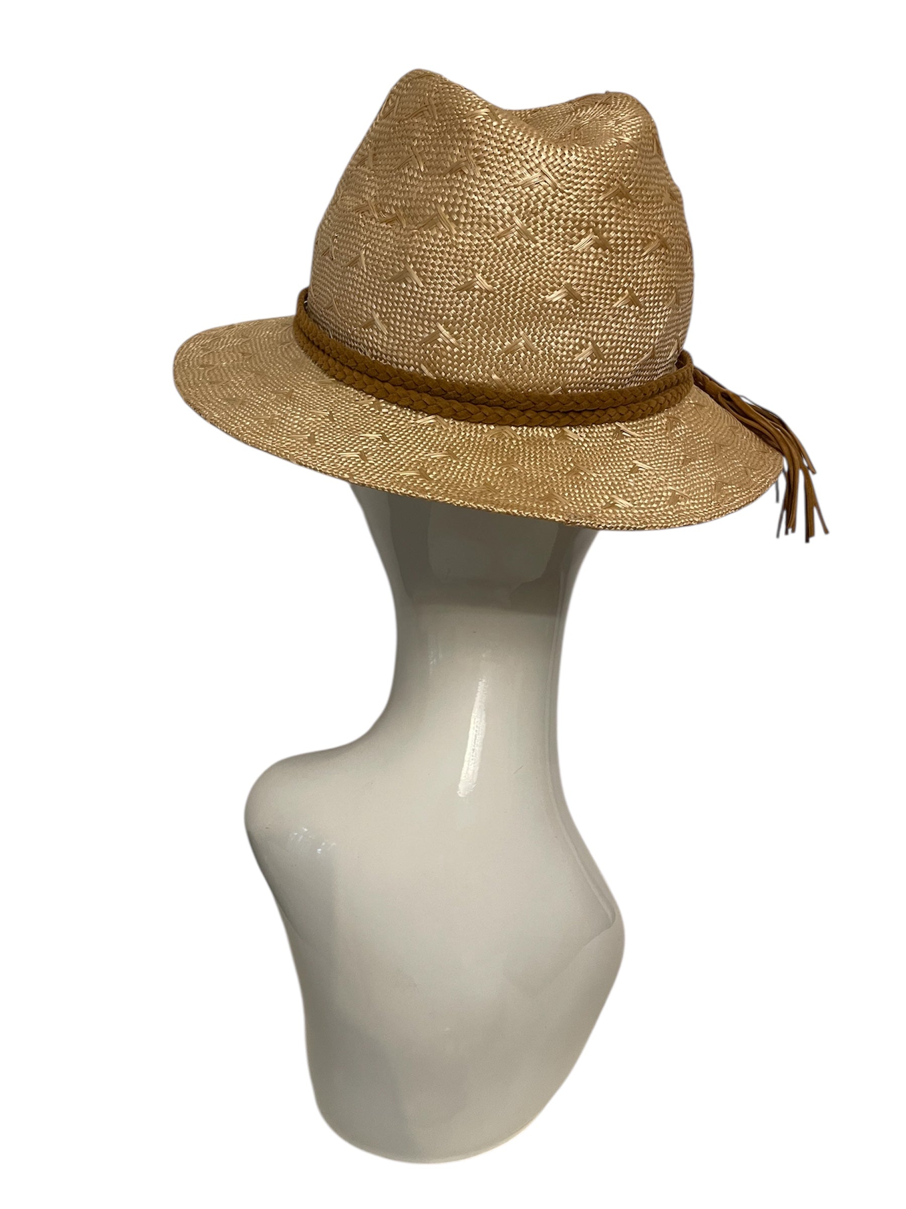 Straw fedora which can be easily worn with various summer outfits. It can be worn as it is or adorned with your own choices of trims, or, why not, fresh flowers picked up during your summer walks.